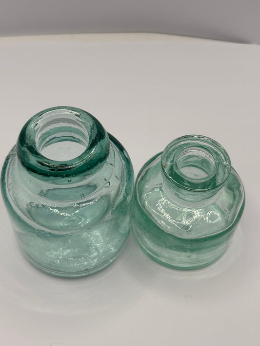 2 old aqua glass inkwells. Ink bottles. Smooth top