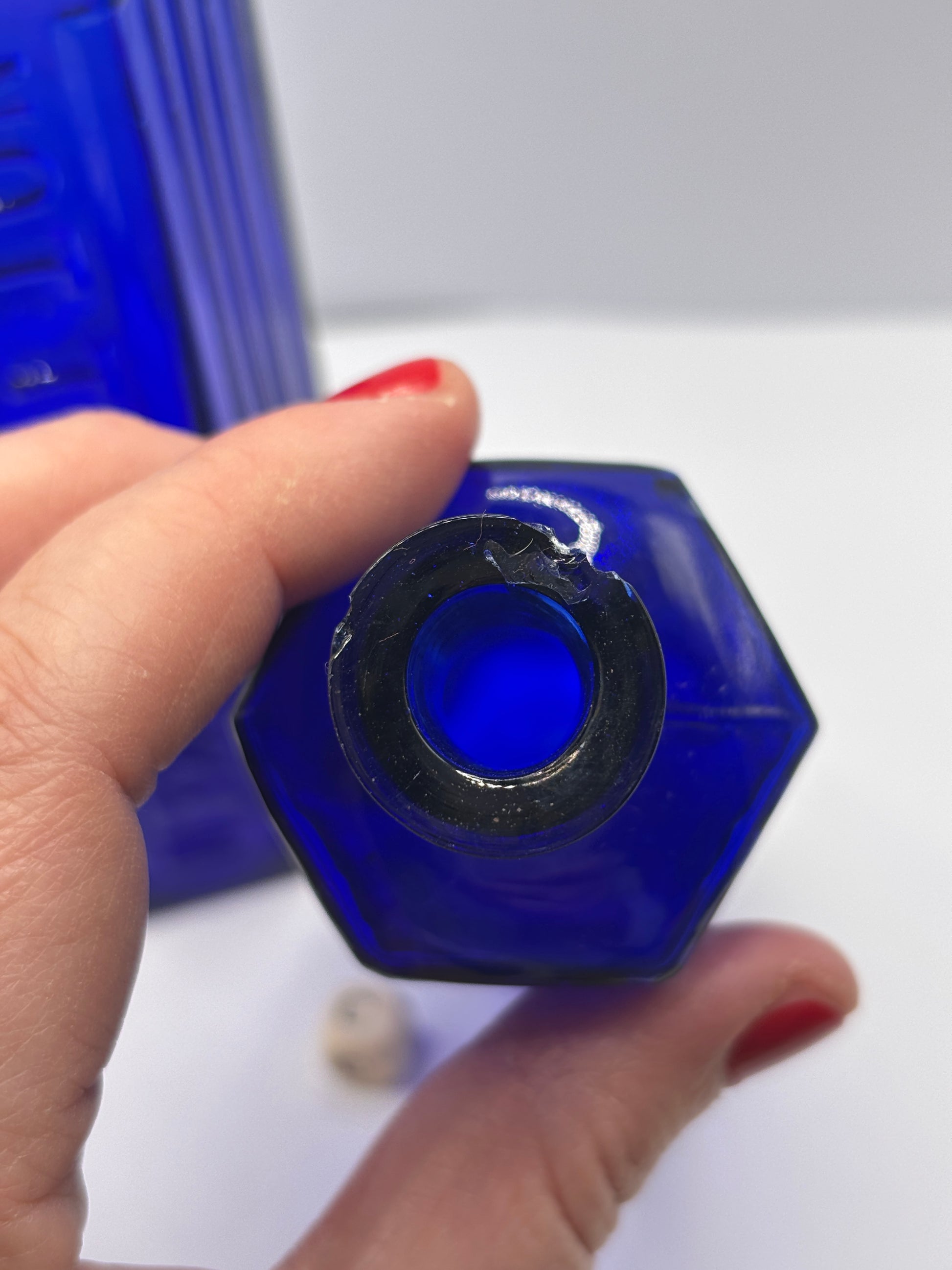 2 Old blue glass ribbed poison bottles. ‘not to be taken’ (C) damaged