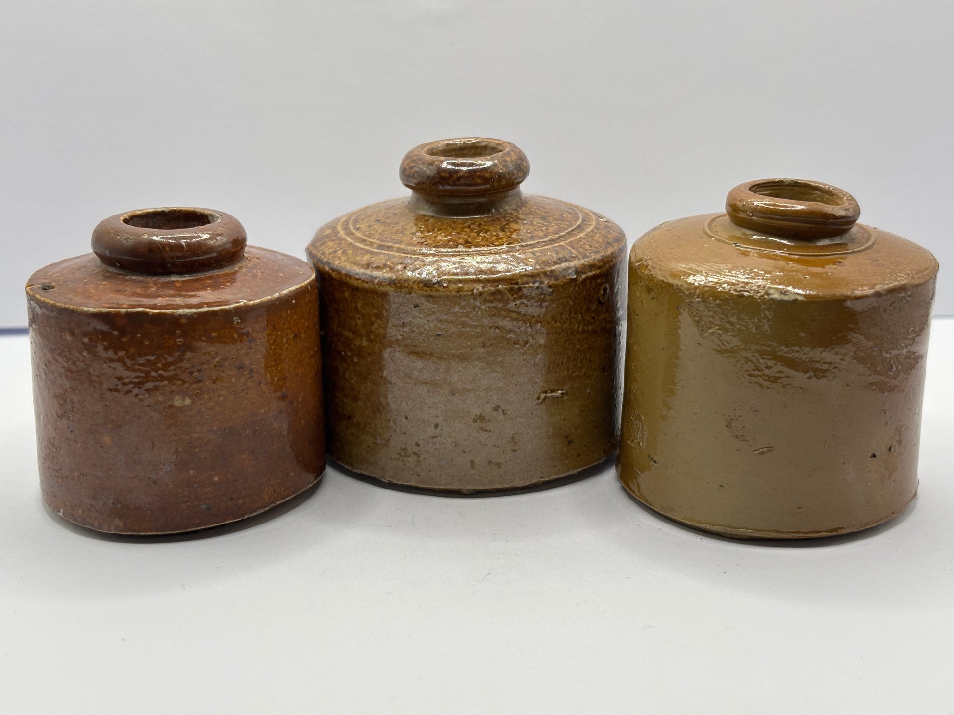 3 old brown stoneware inkwells, ink bottles. Pork pie inks
