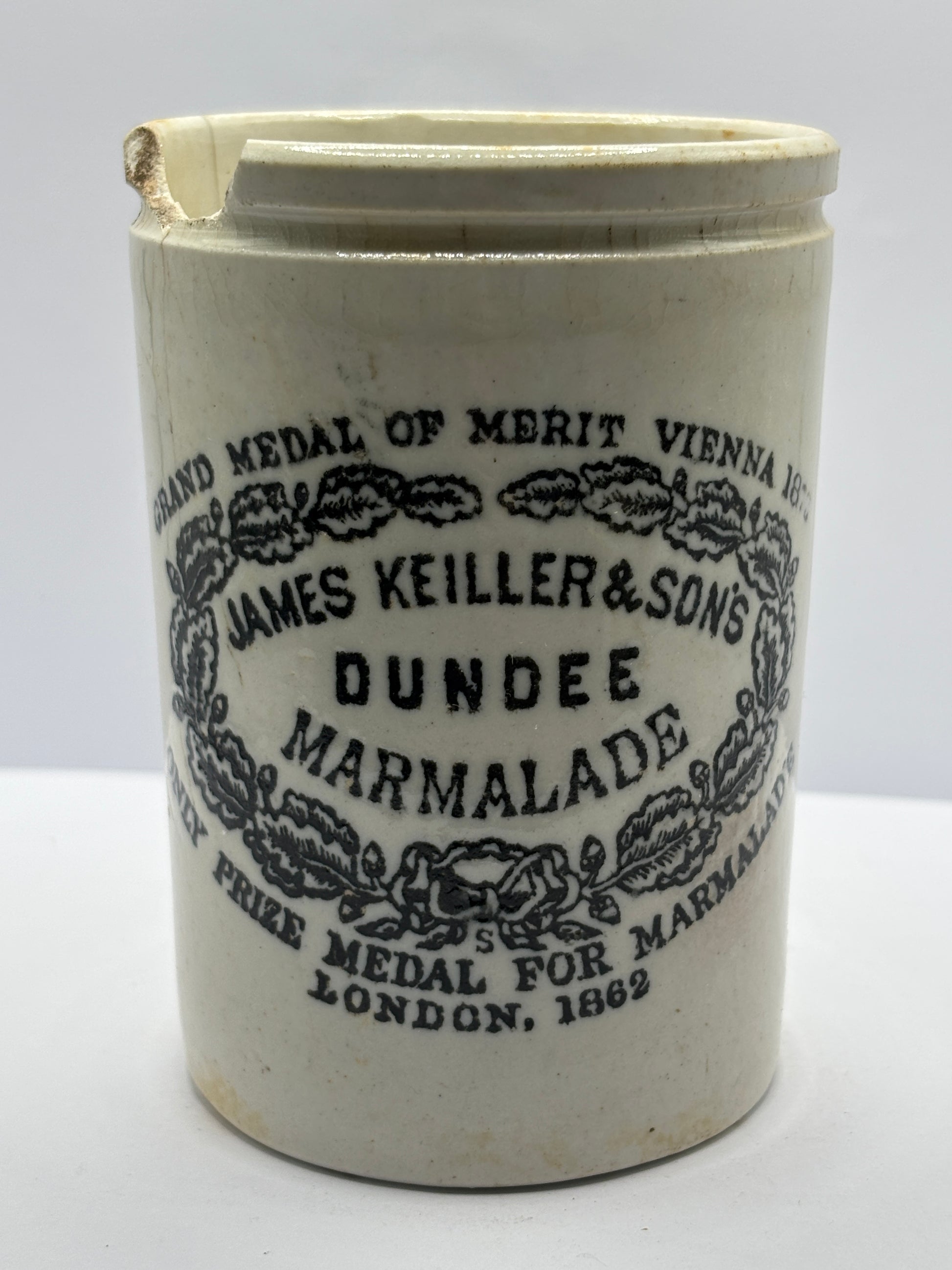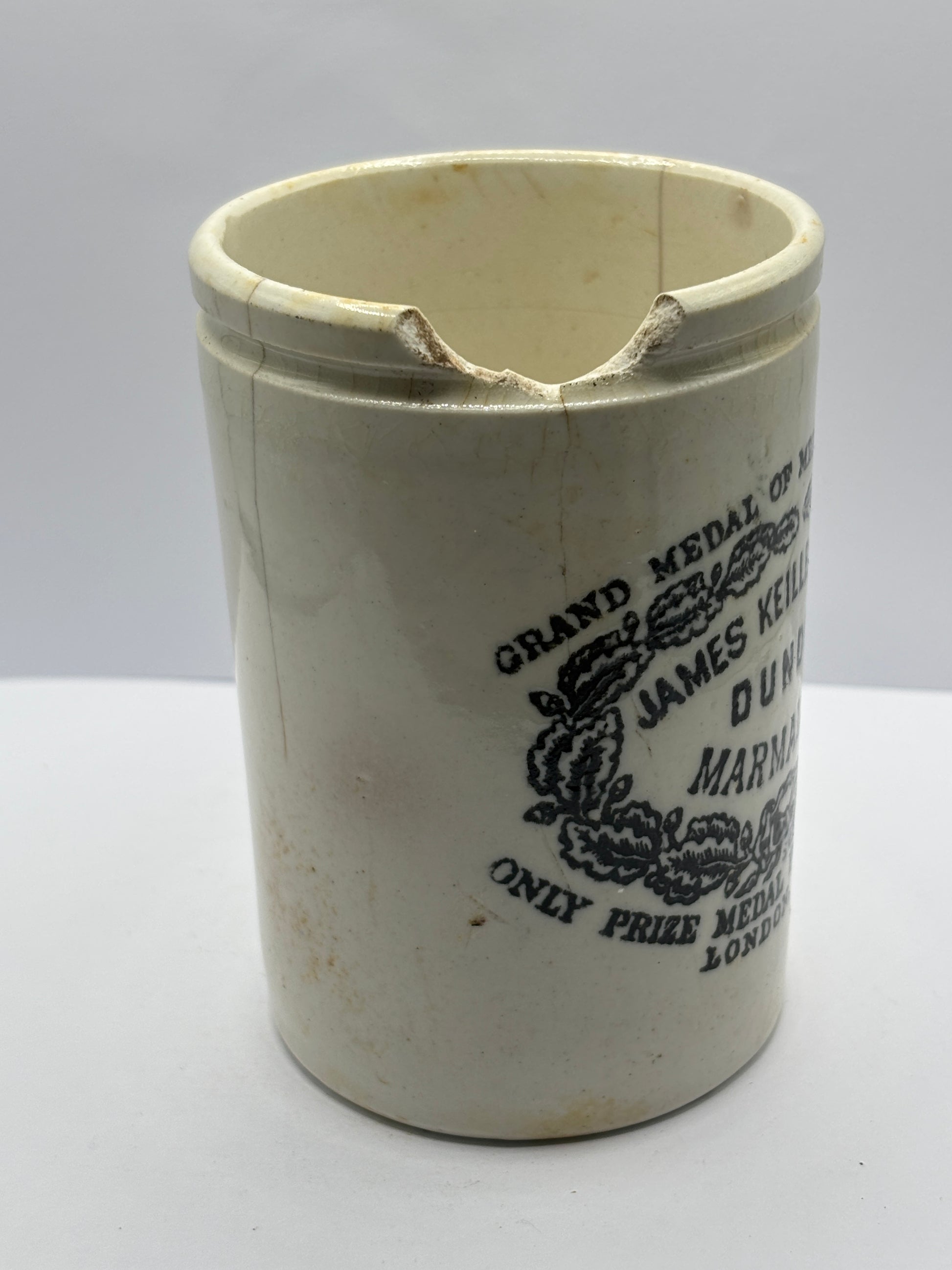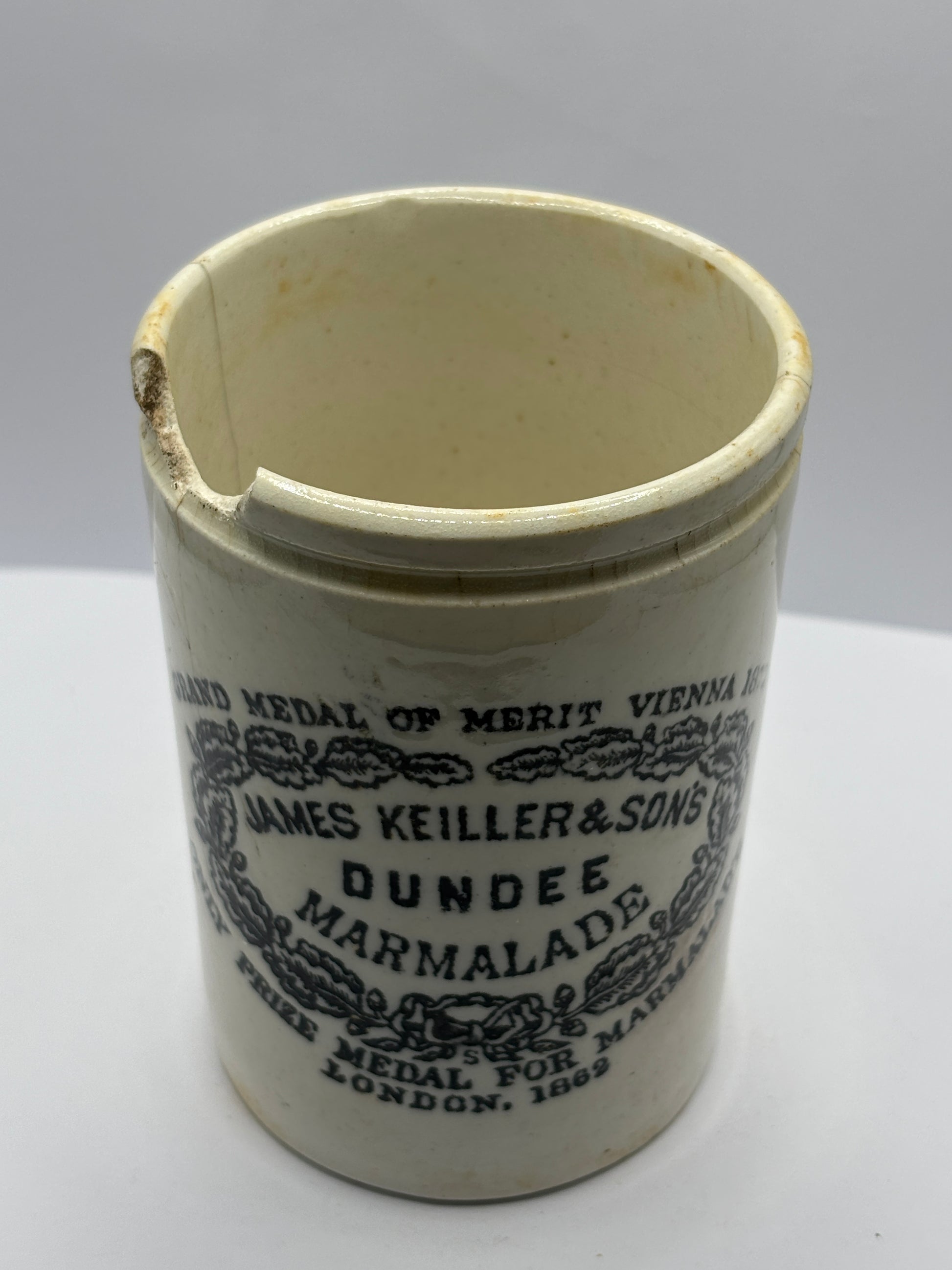 Old 1lb James Keiller Dundee marmalade jar. Damaged