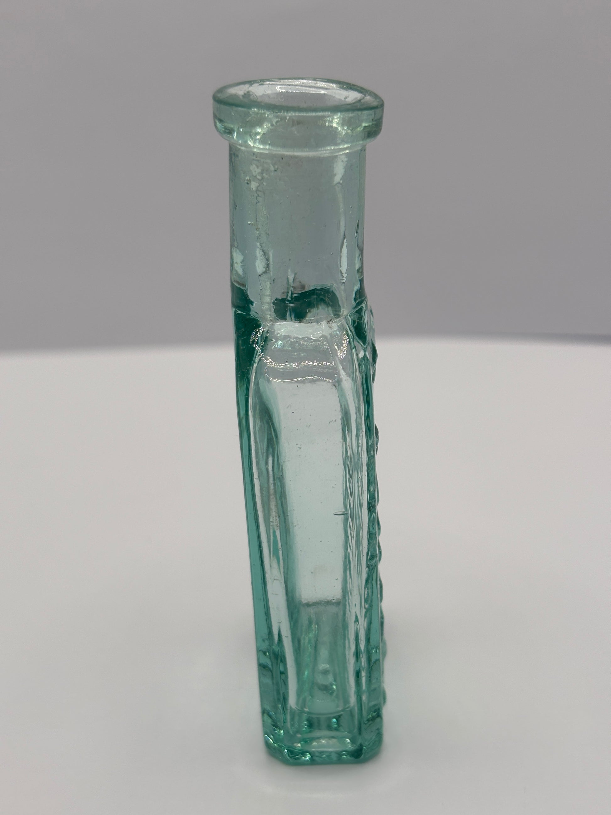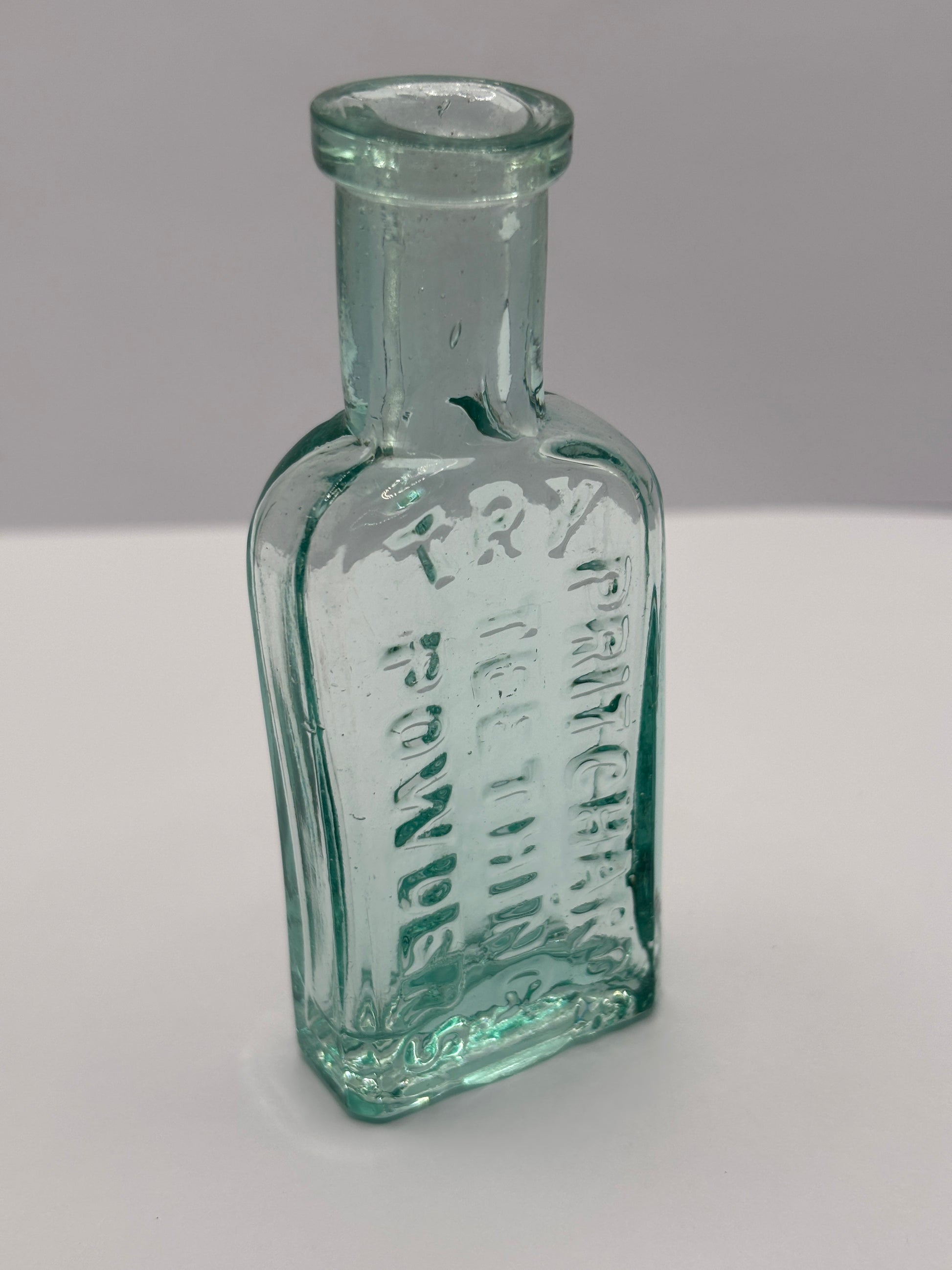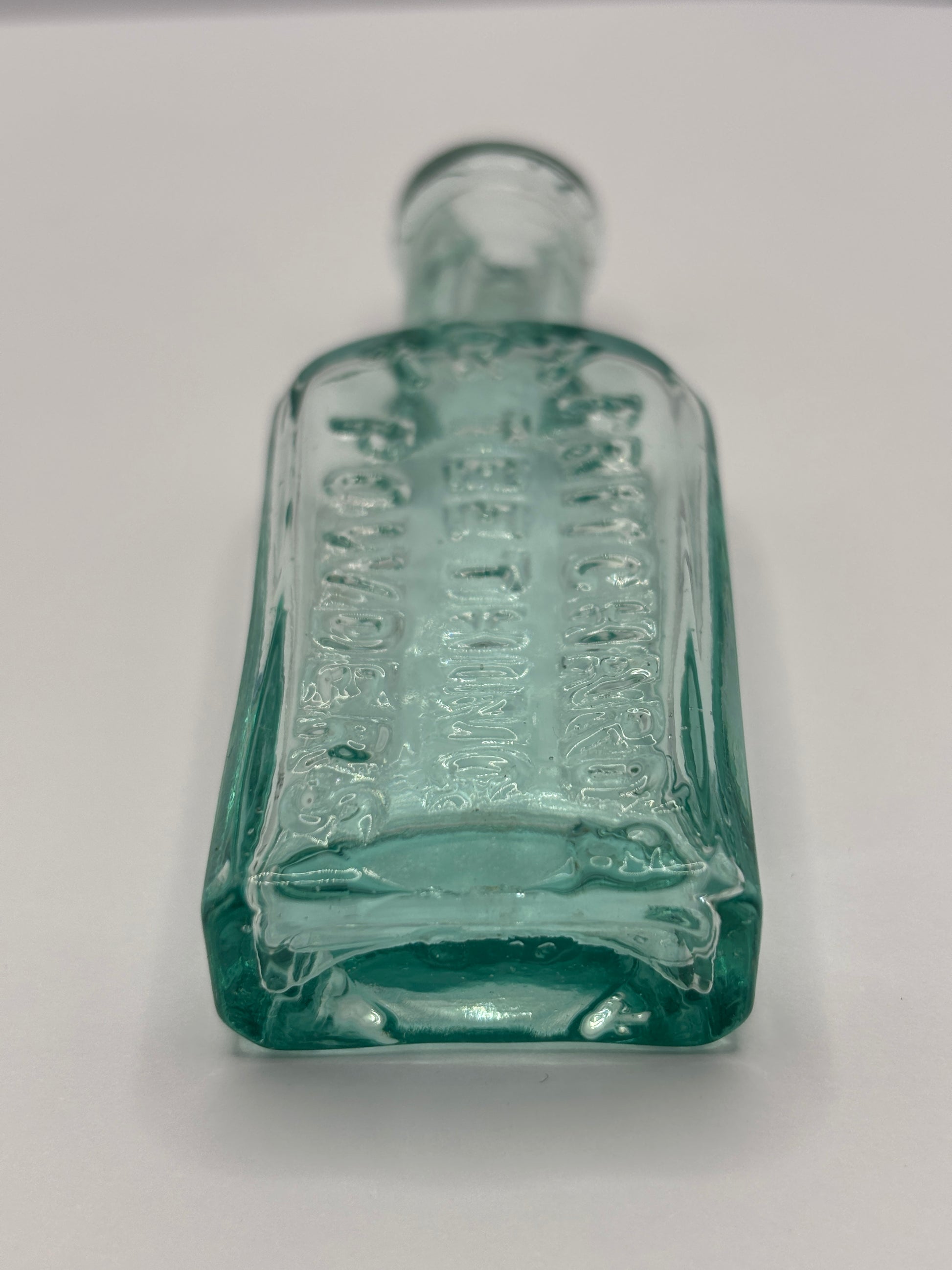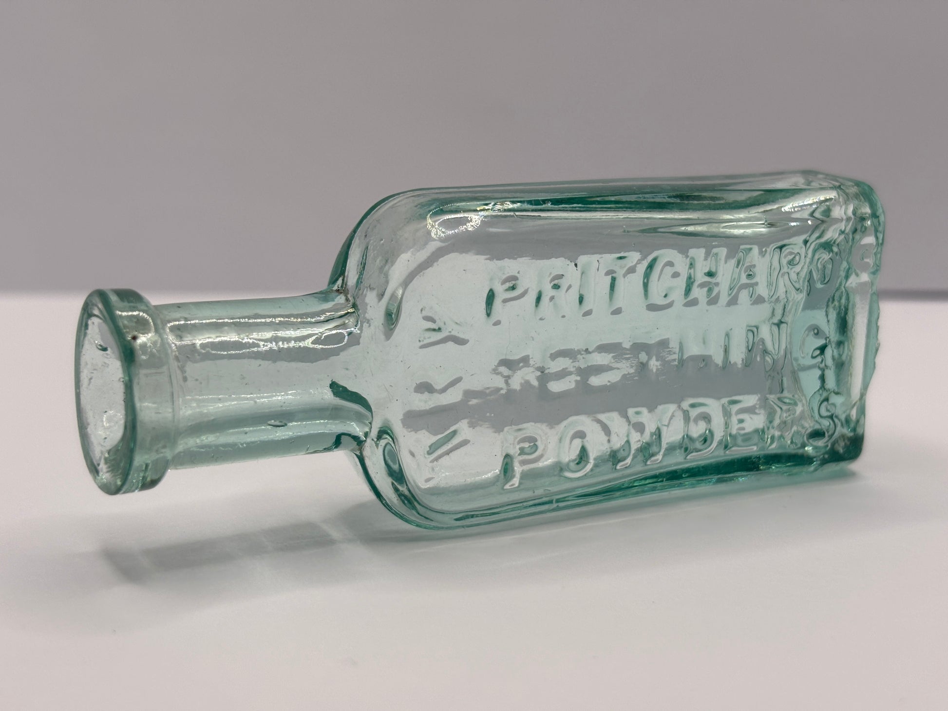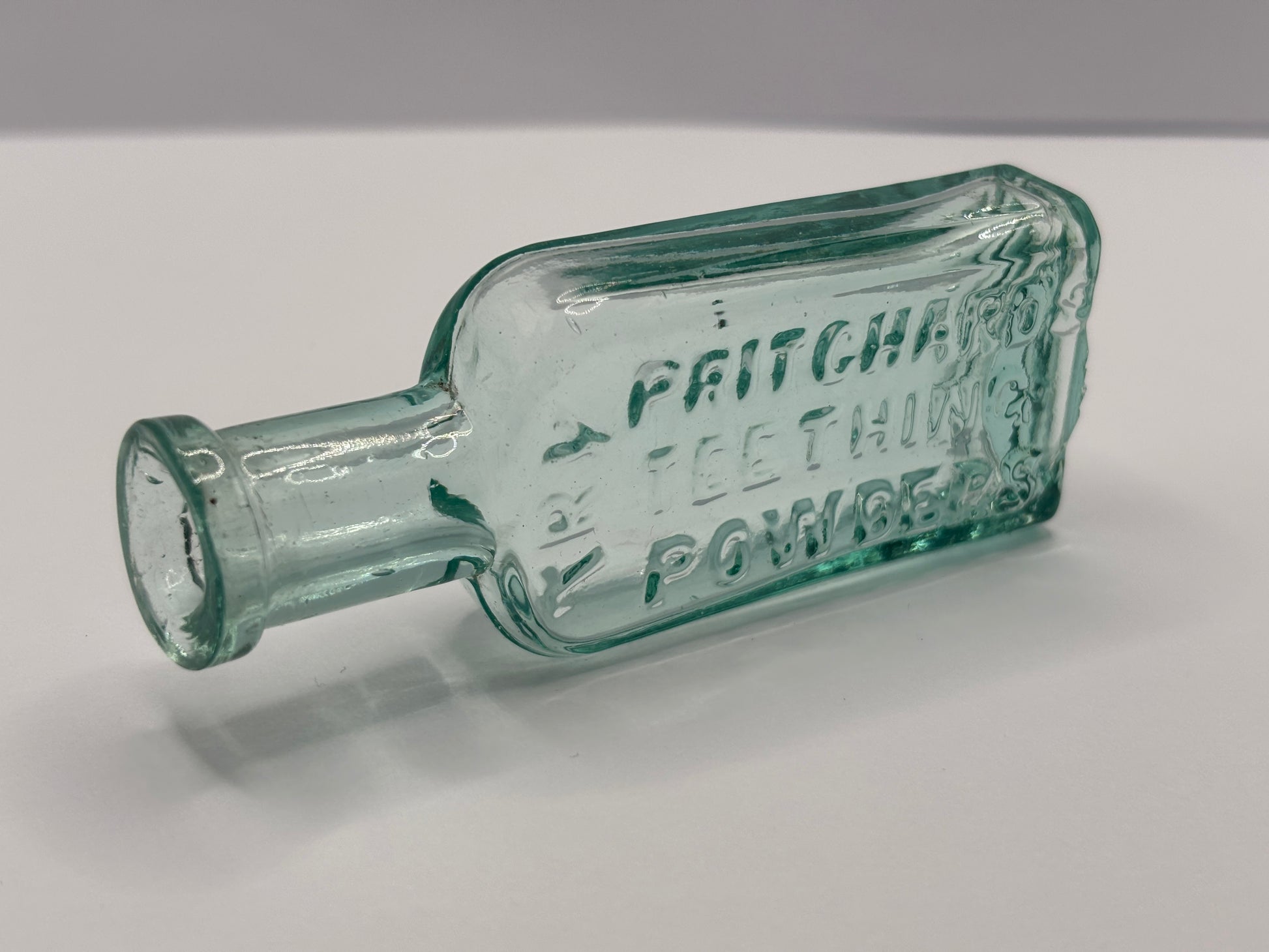 Old aqua glass advertising chemist bottle. Pritchards teething powder