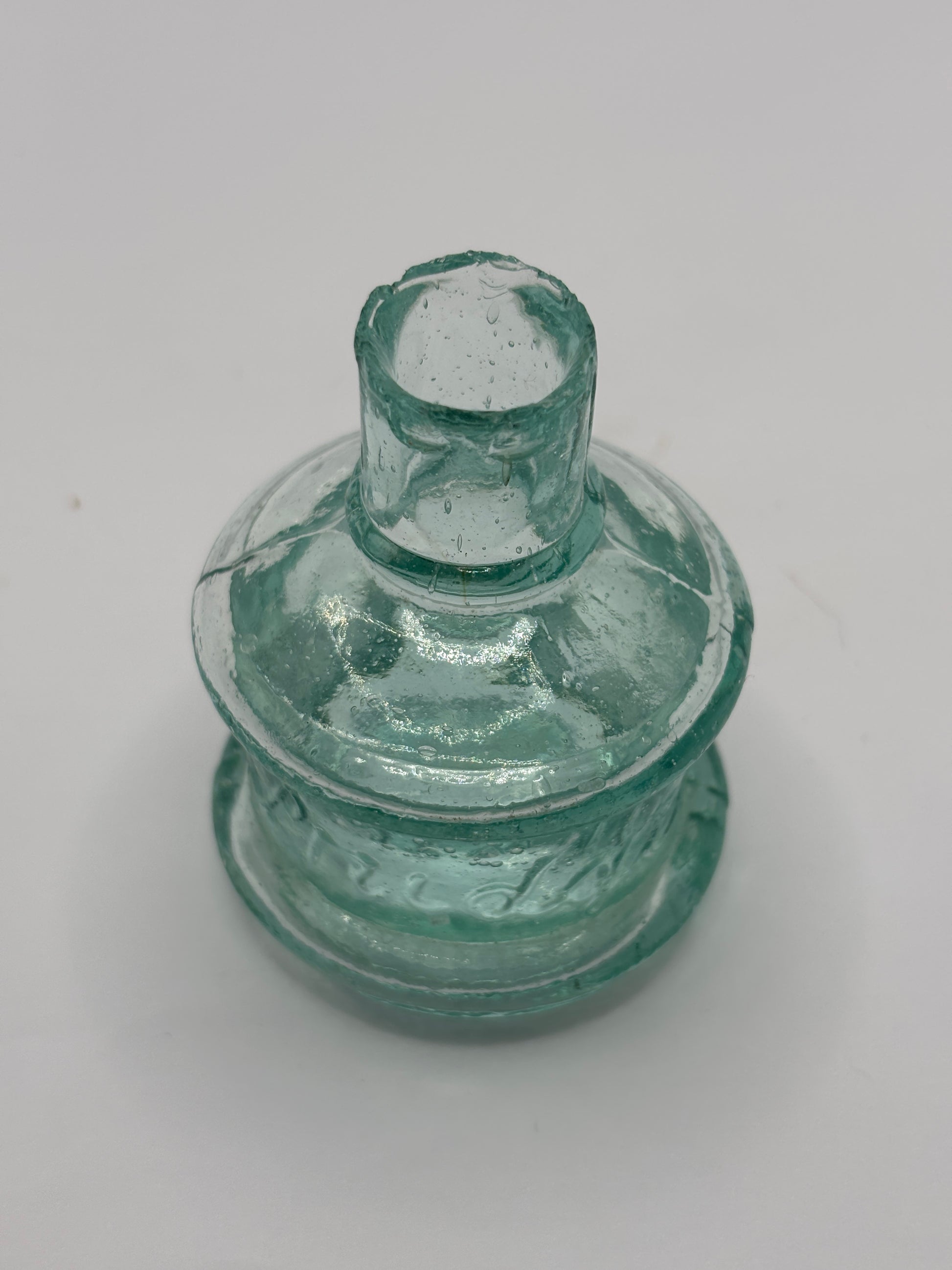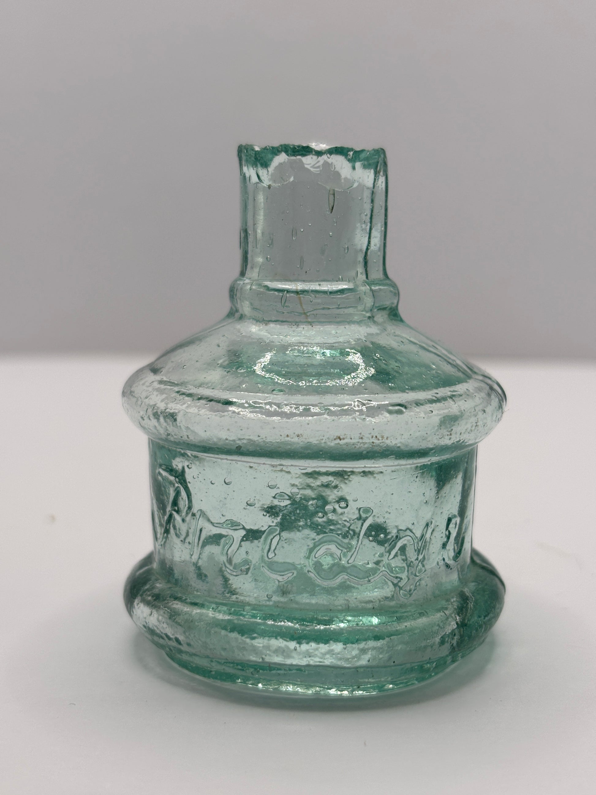 Old aqua glass advertising inkwell, ink bottle. Pridge