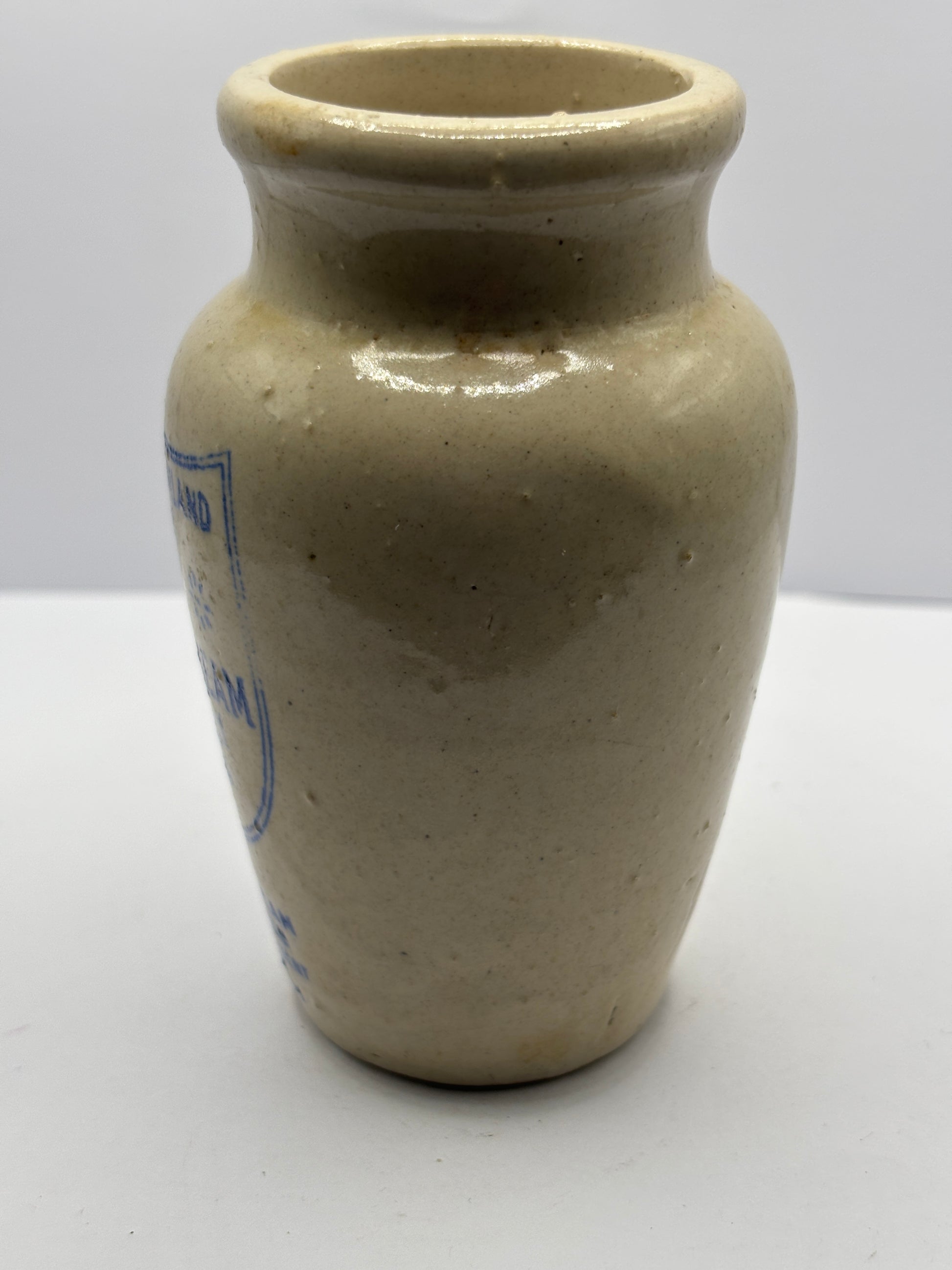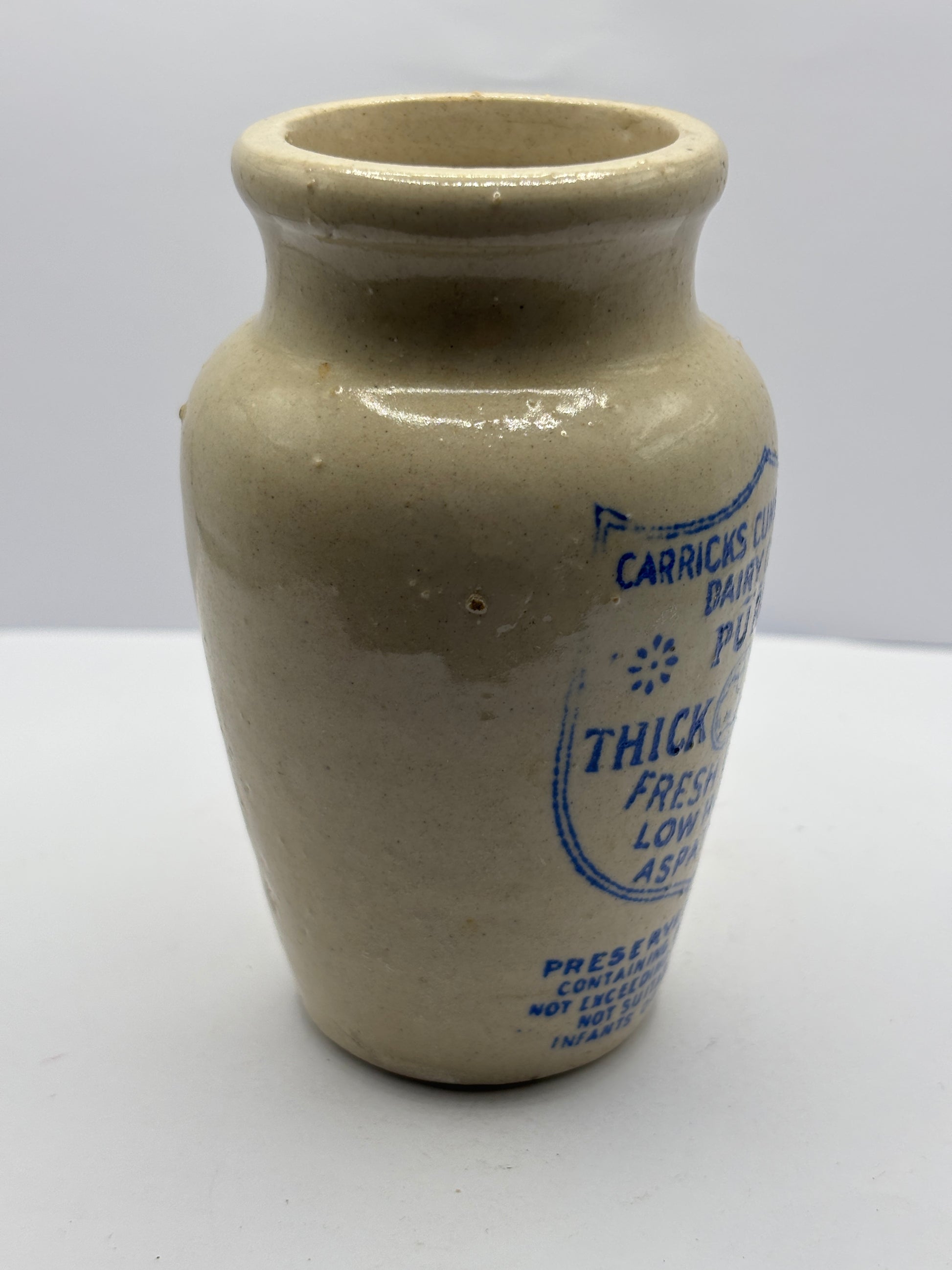 Old blue print advertising stoneware cream pot, Carricks cumberland dairy co, Pure thick cream