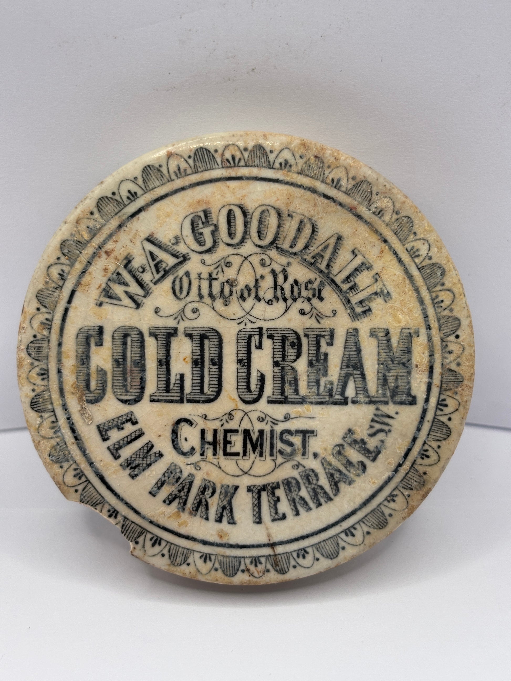 old damaged advertising lid, otto of rose cold cream