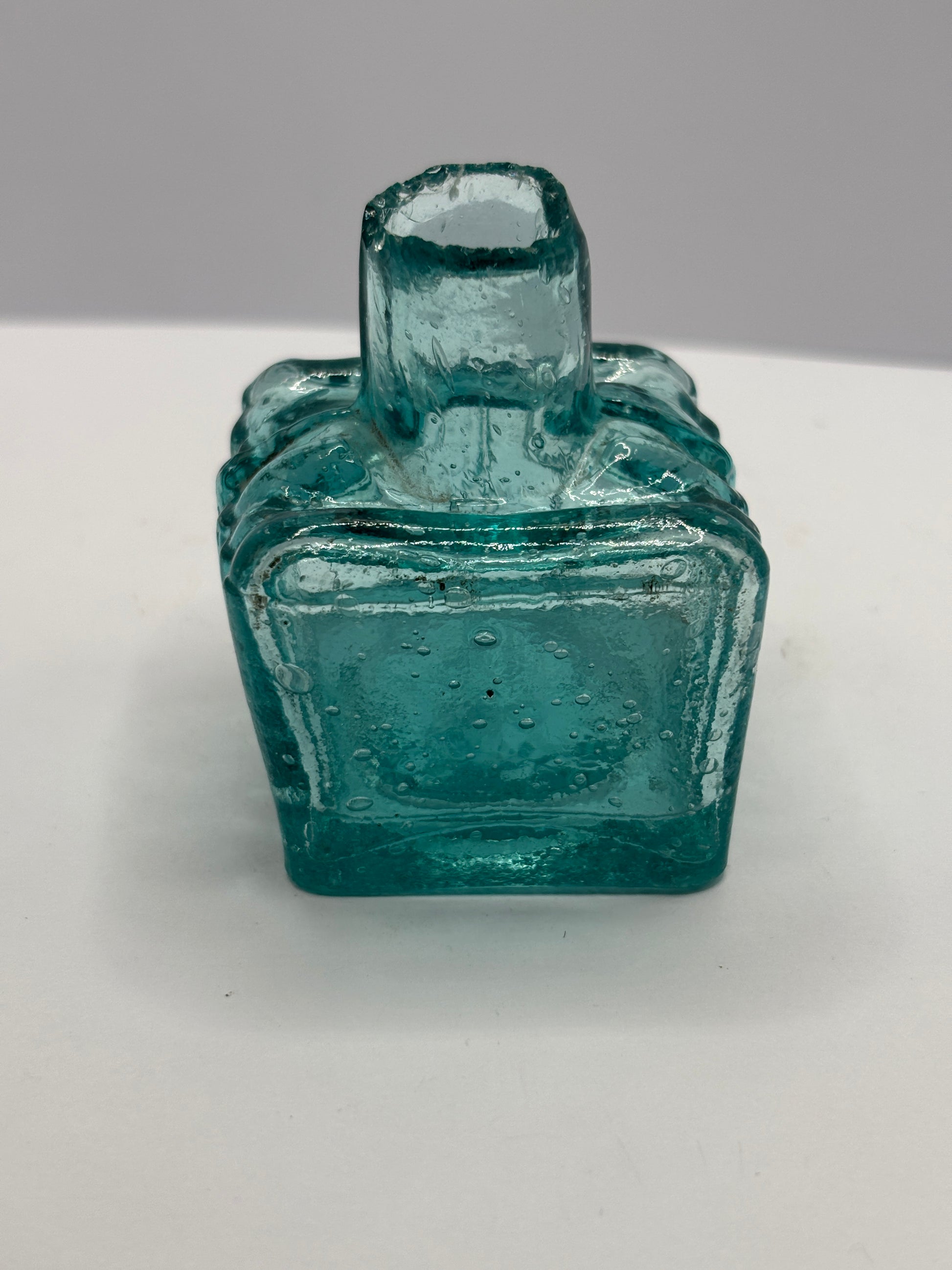 Old Lyons ink, aqua glass ribbed penny ink, inkwell