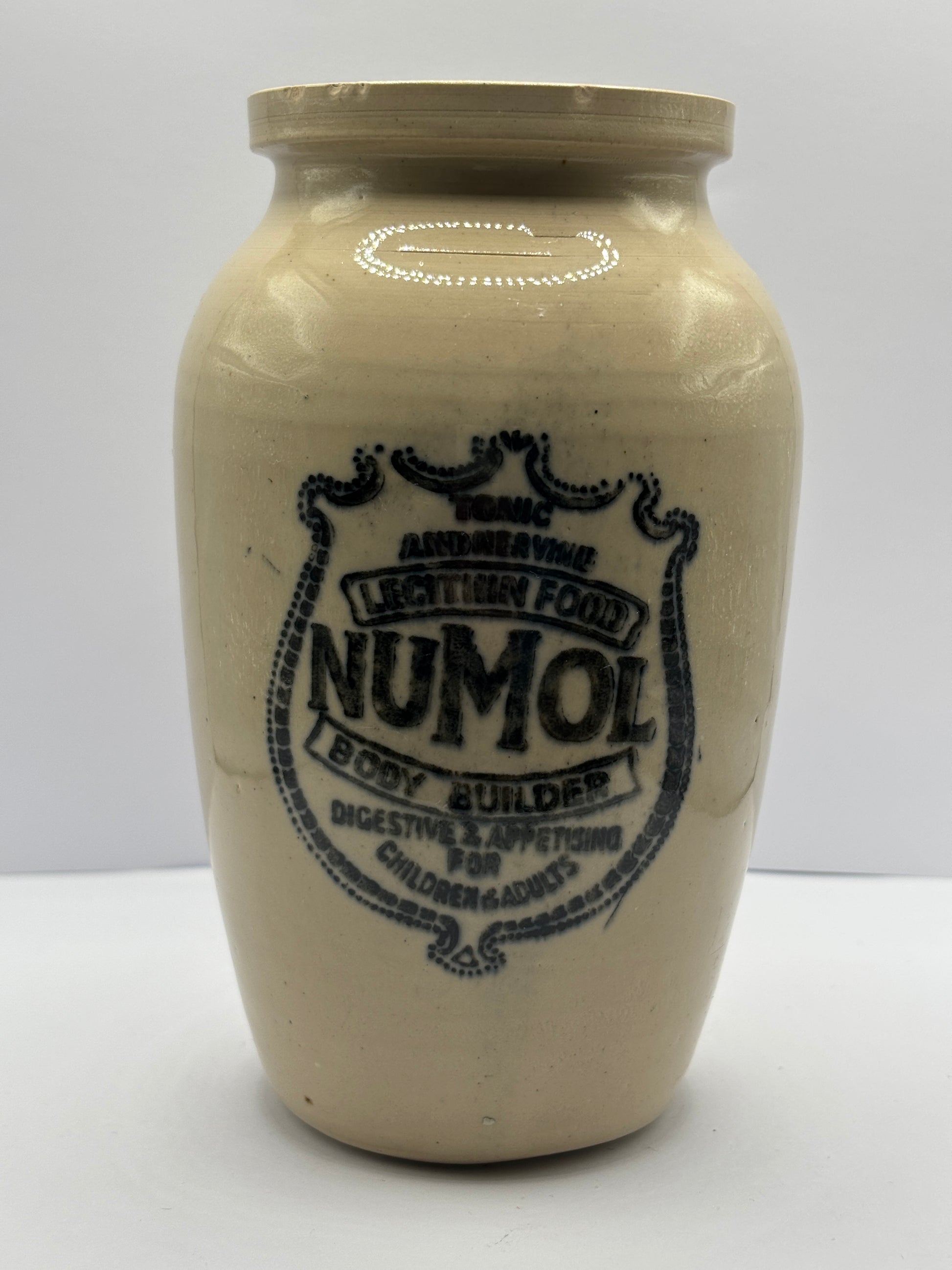 Old numol body builder advertising jar, 13cms