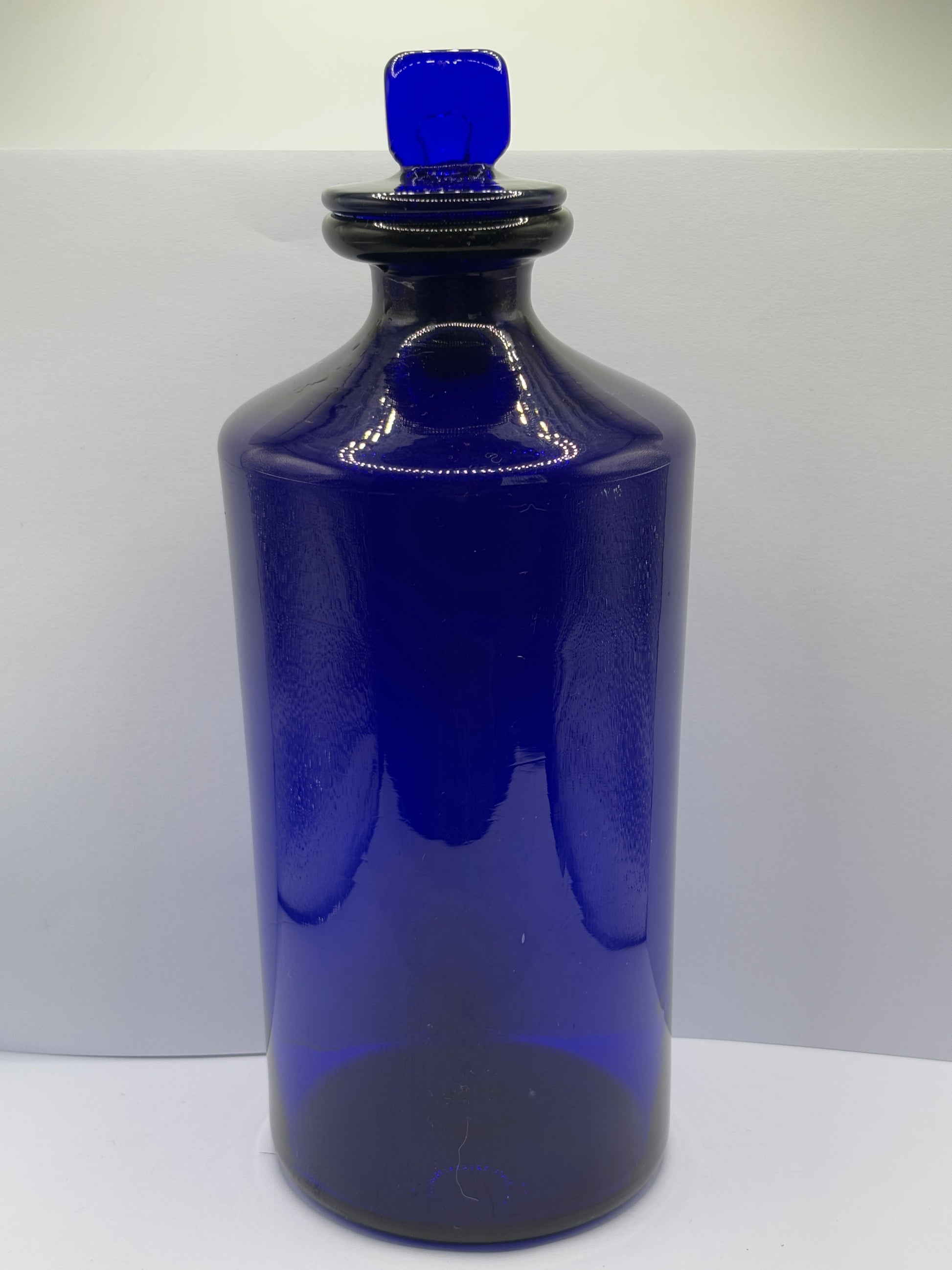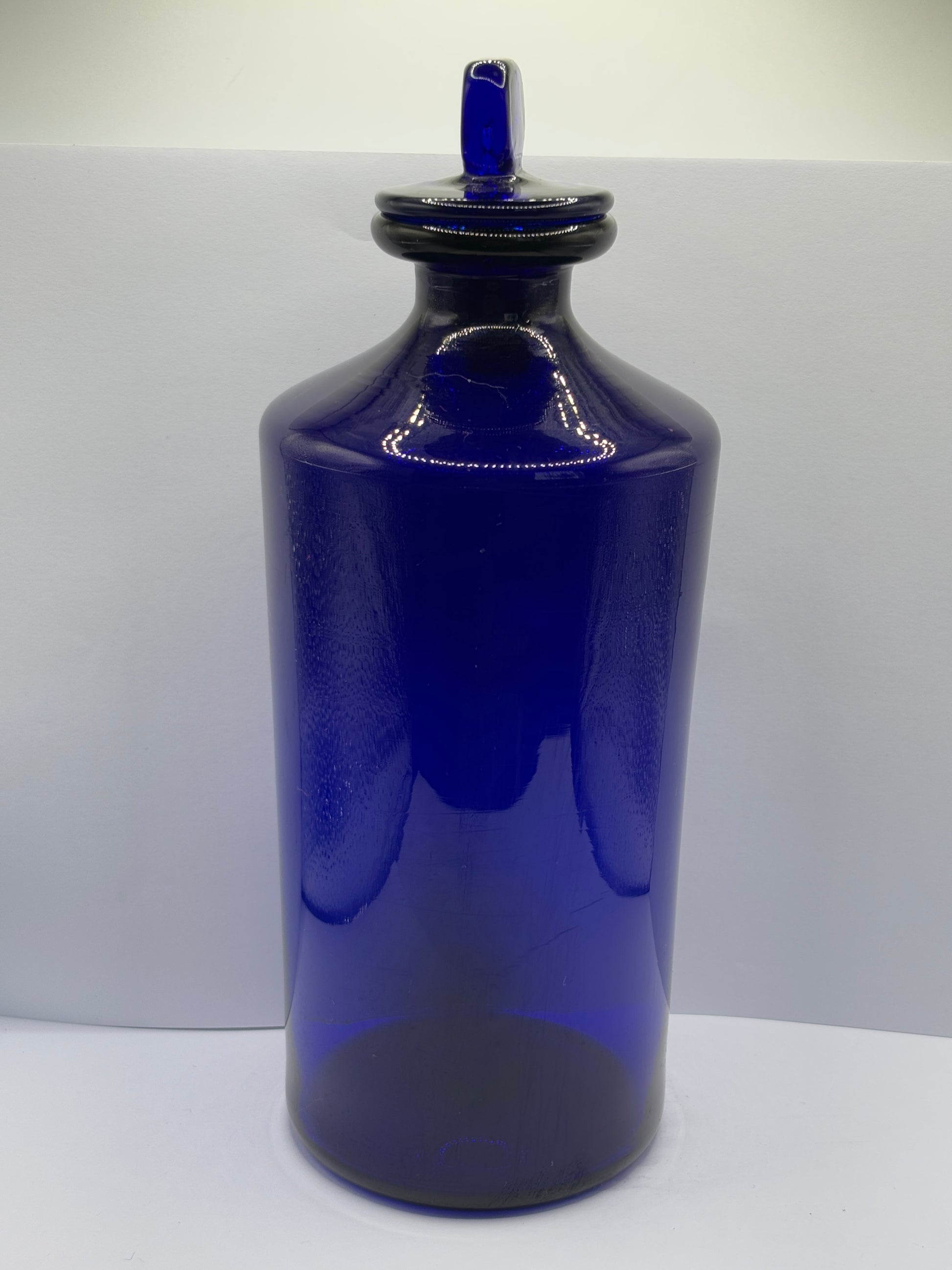 Old pontilled blue glass chemist jar, chemist round. Pharmacy