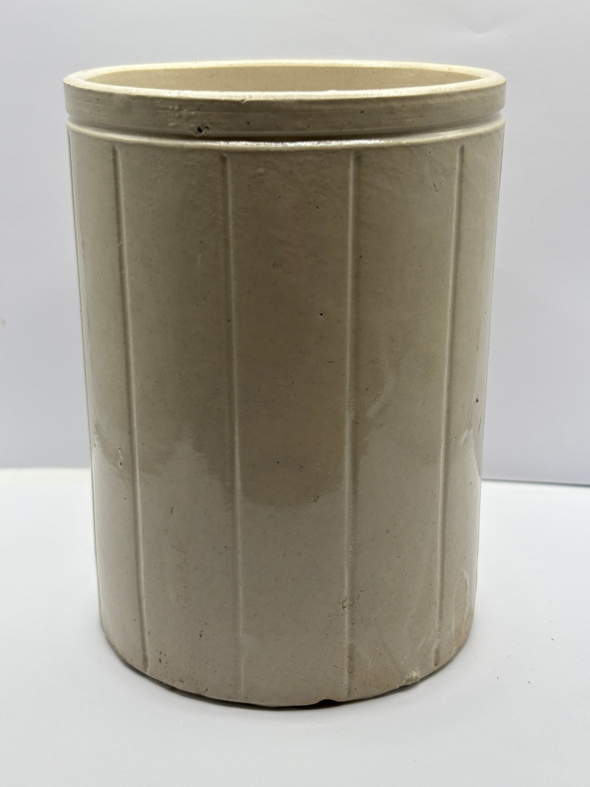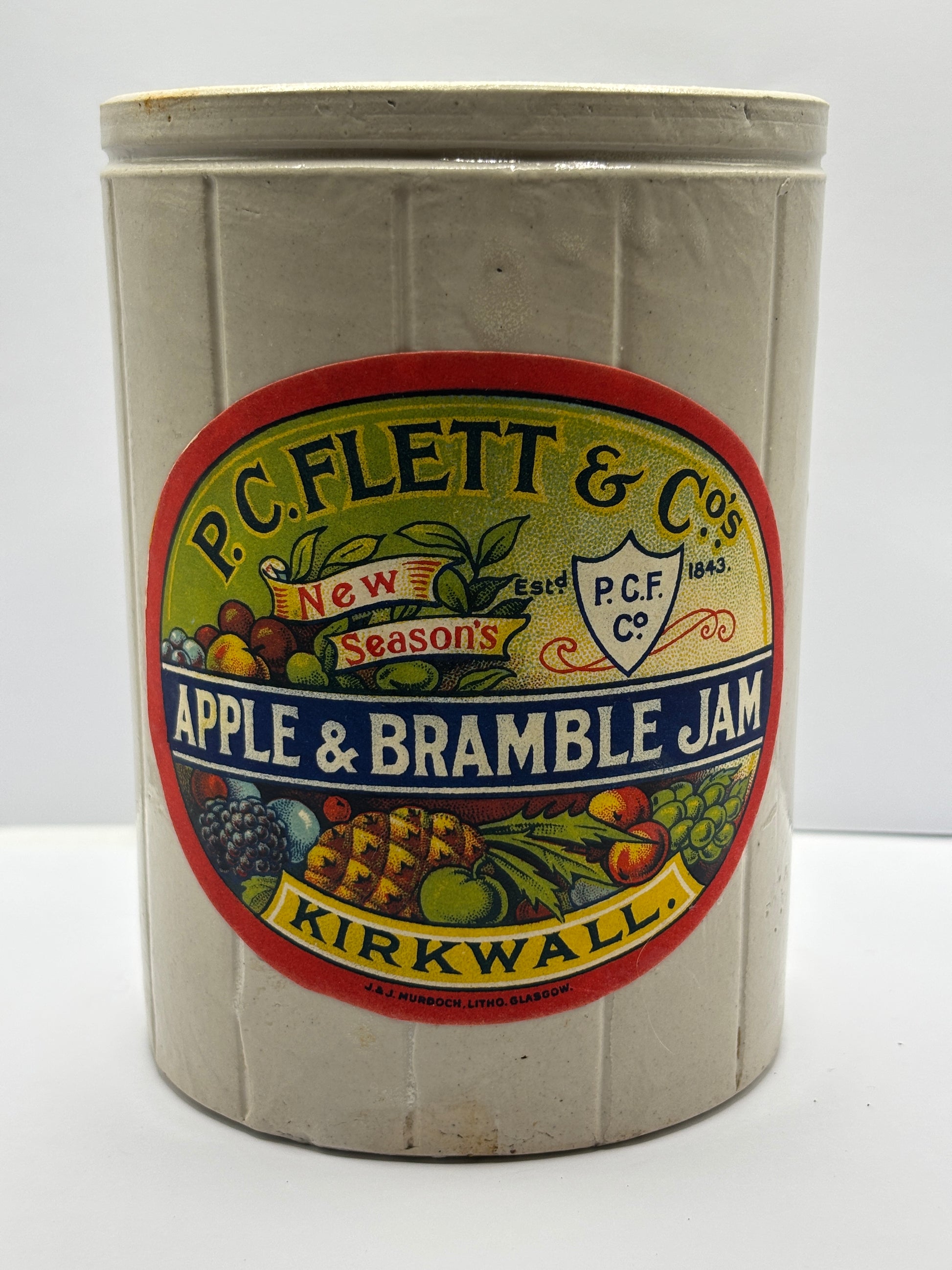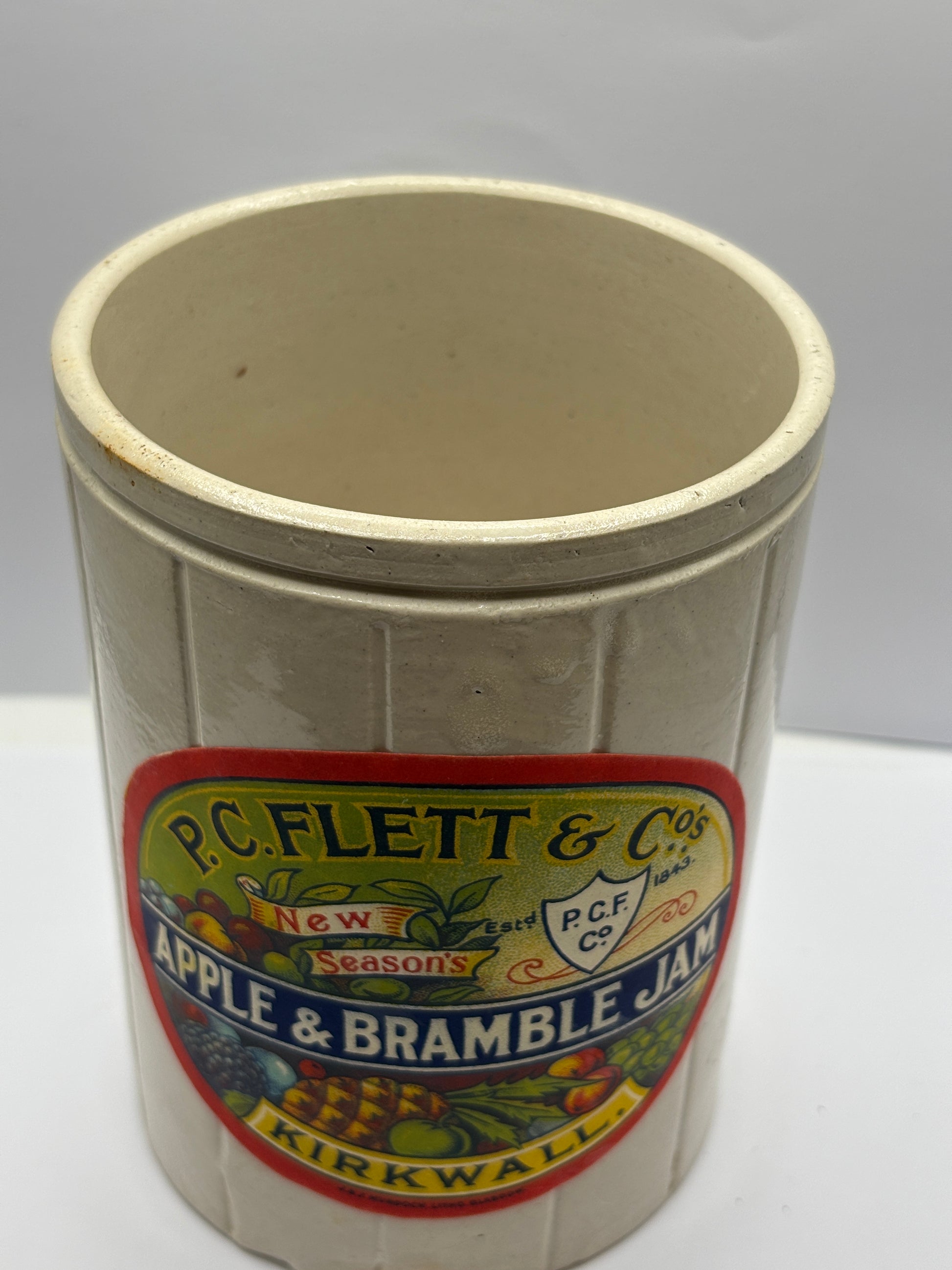 Old ribbed stoneware jam pot with added label