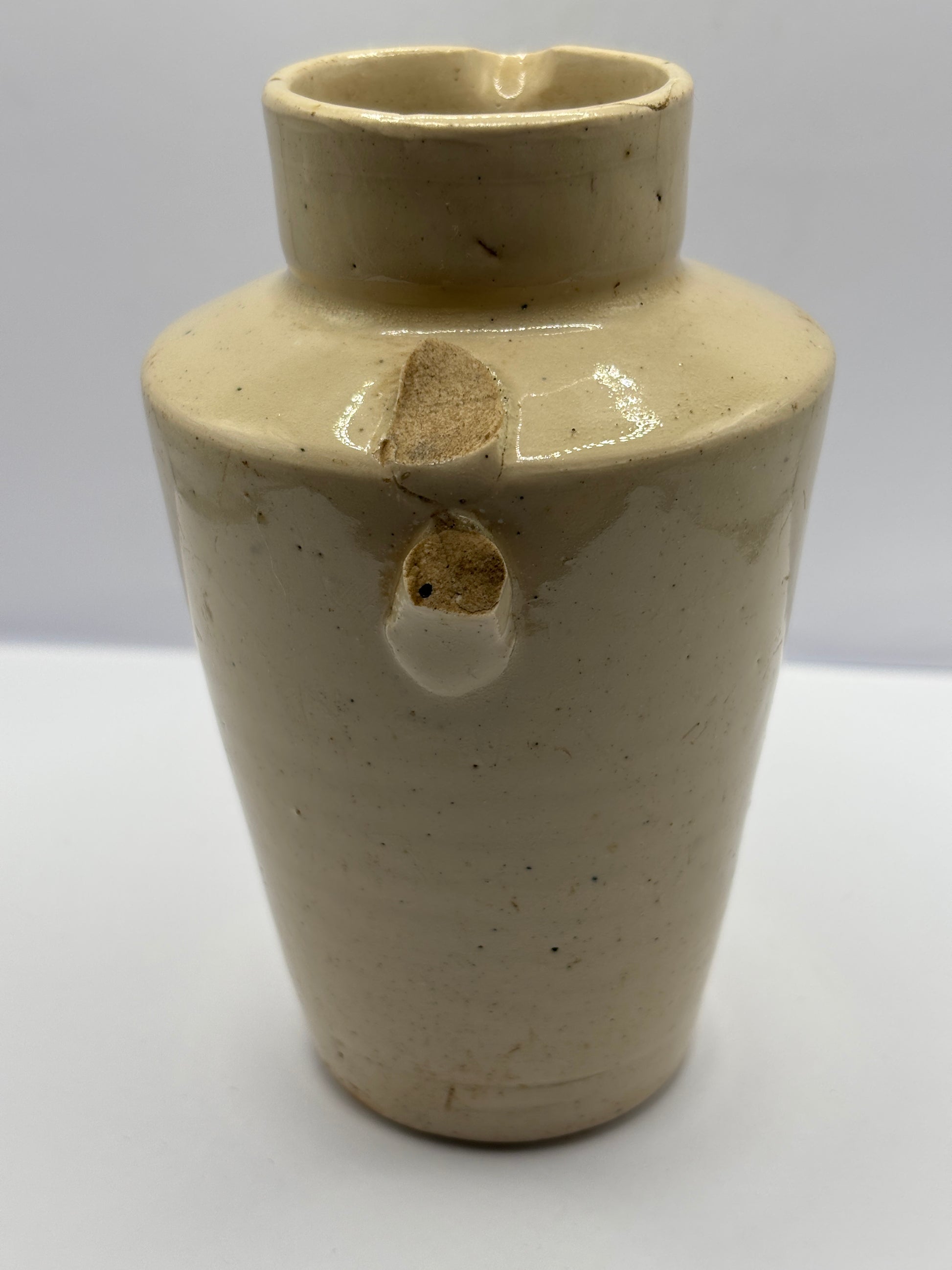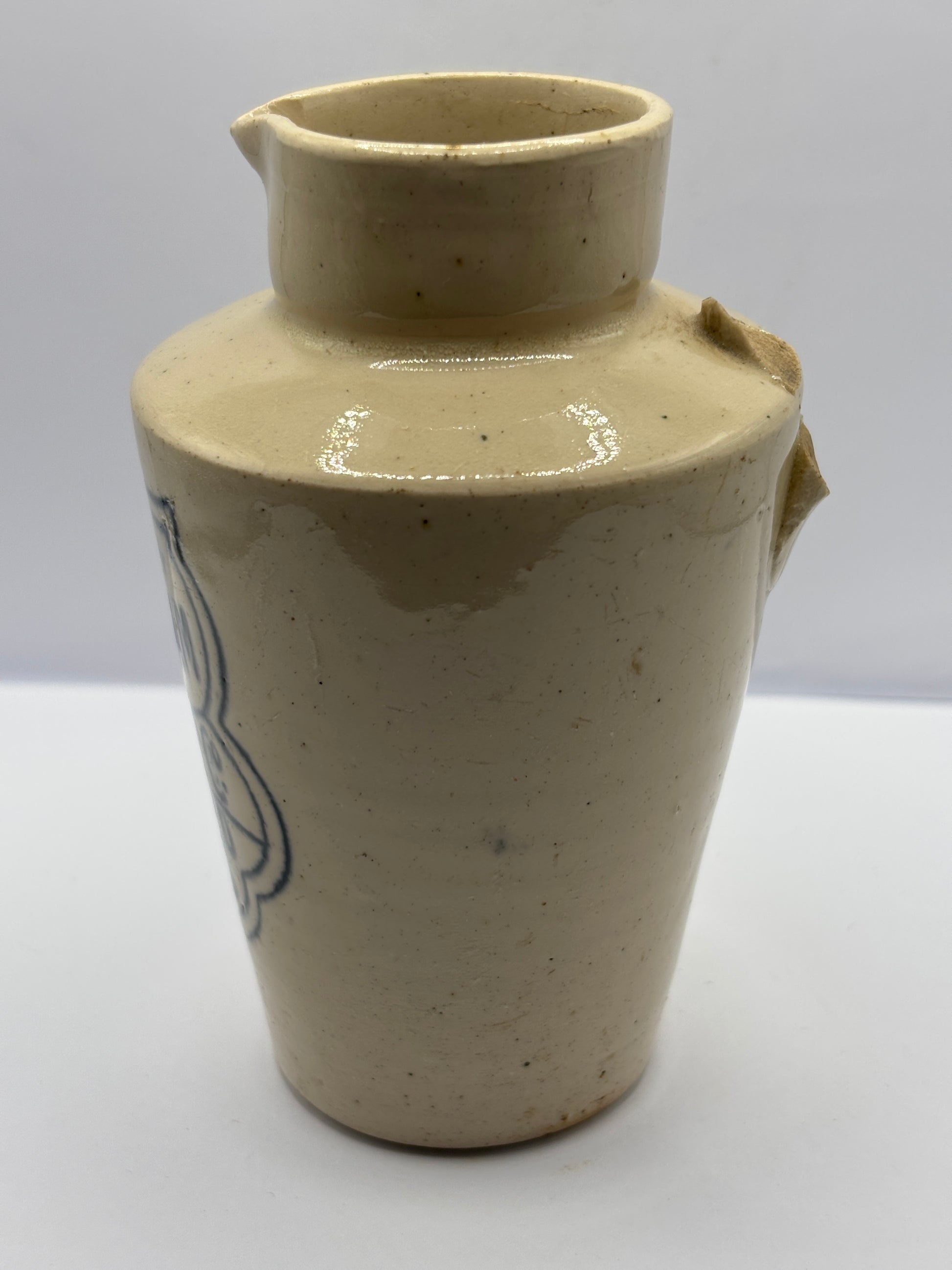 Old stoneware advertising cream pot, Pure fresh cream, Danish dairy co. Damaged