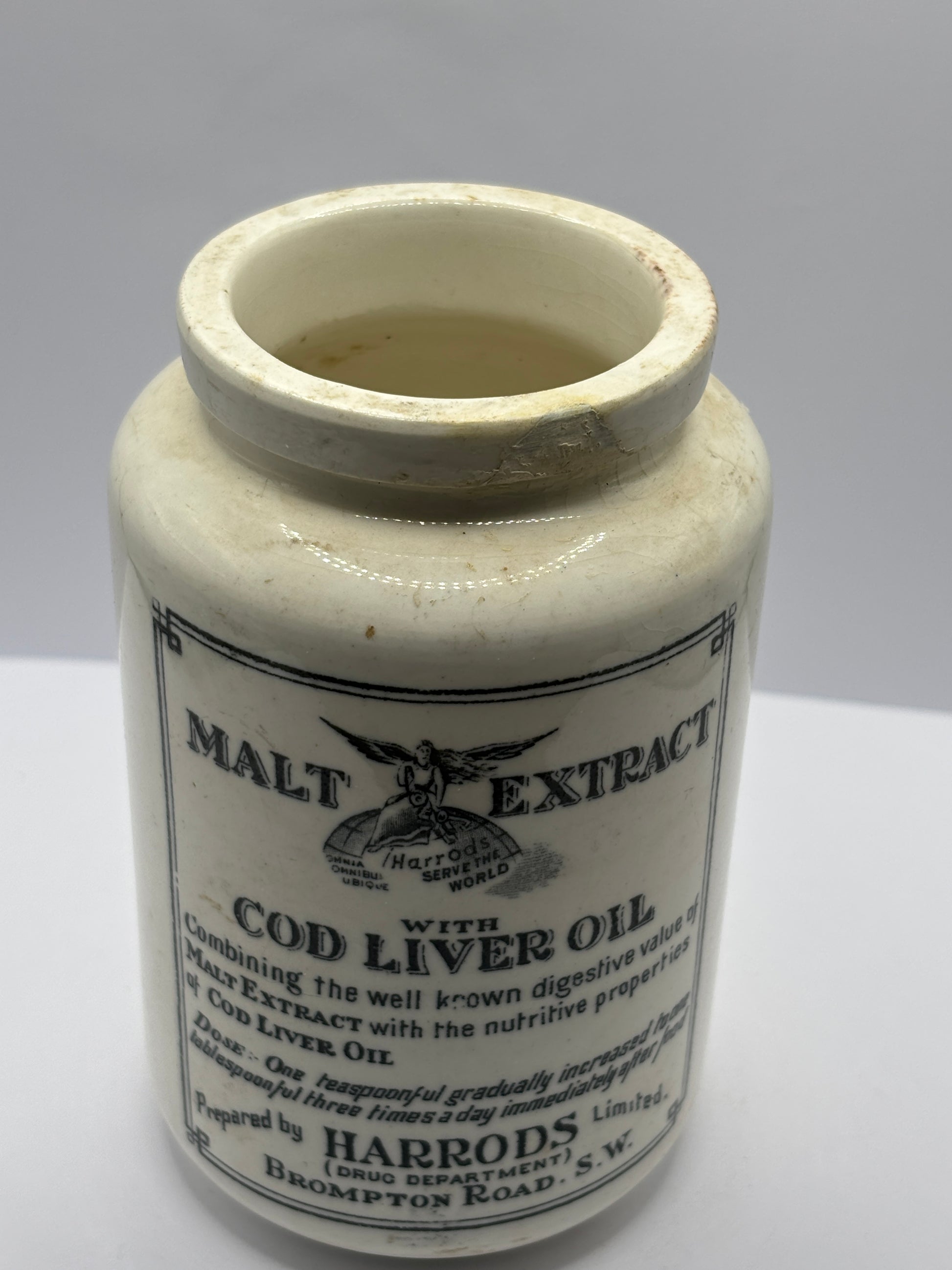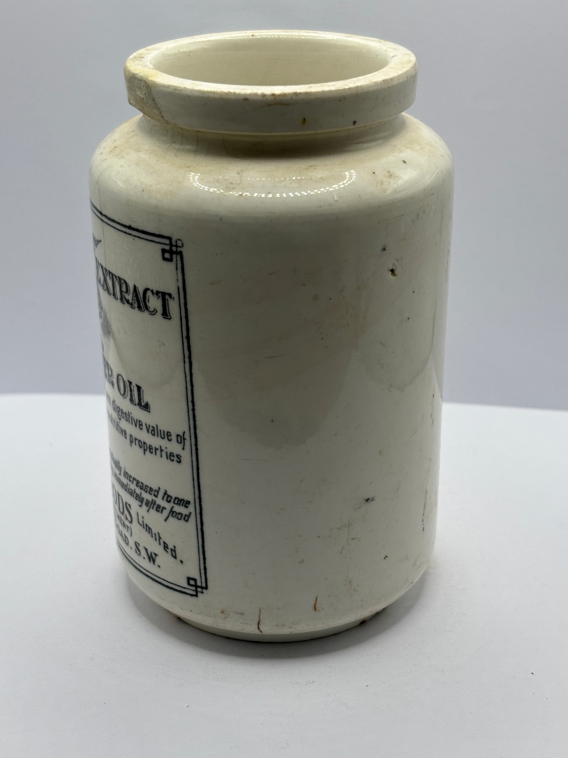 Old stoneware advertising malt extract jar. Repaired